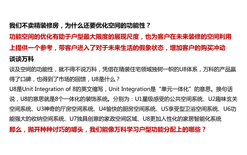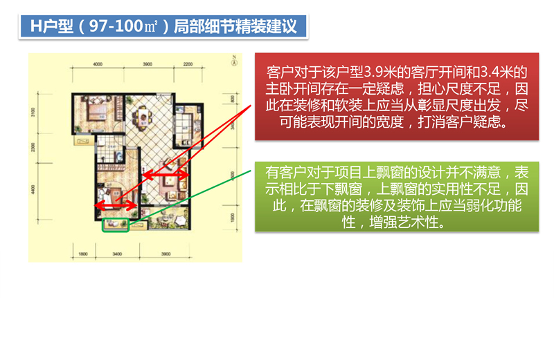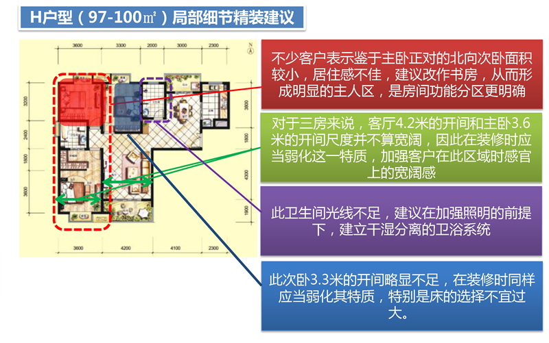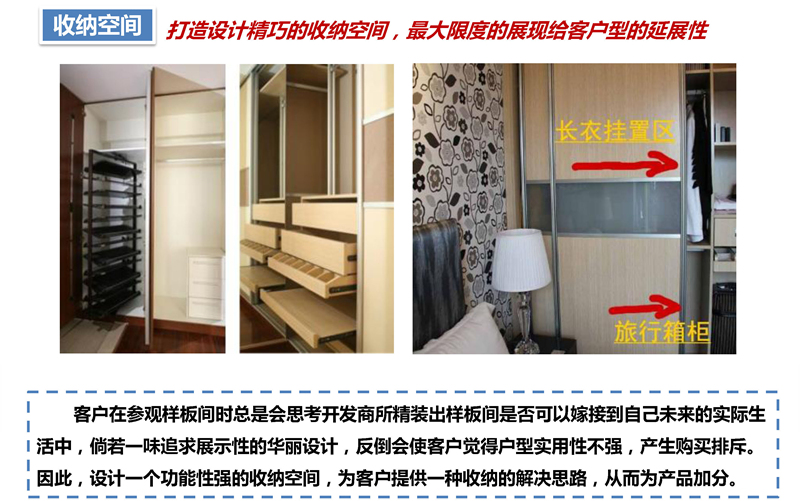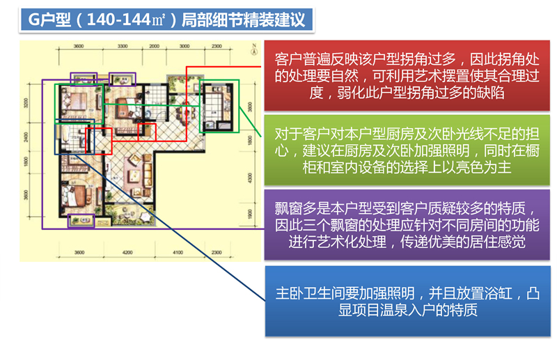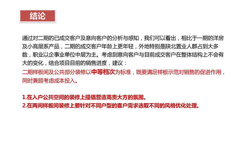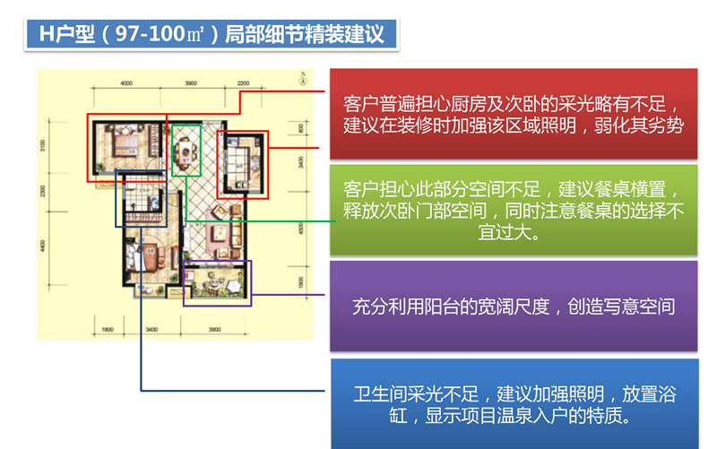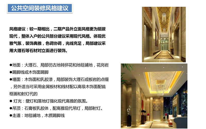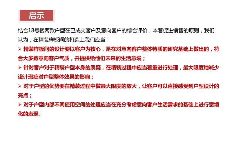 从客户的购买产品时的实际考虑出发,结合已成交客户对于产品的评价及意向客户对于产品的疑虑,有针对性地对于入户公共空间及样板间的精装修给到建议。